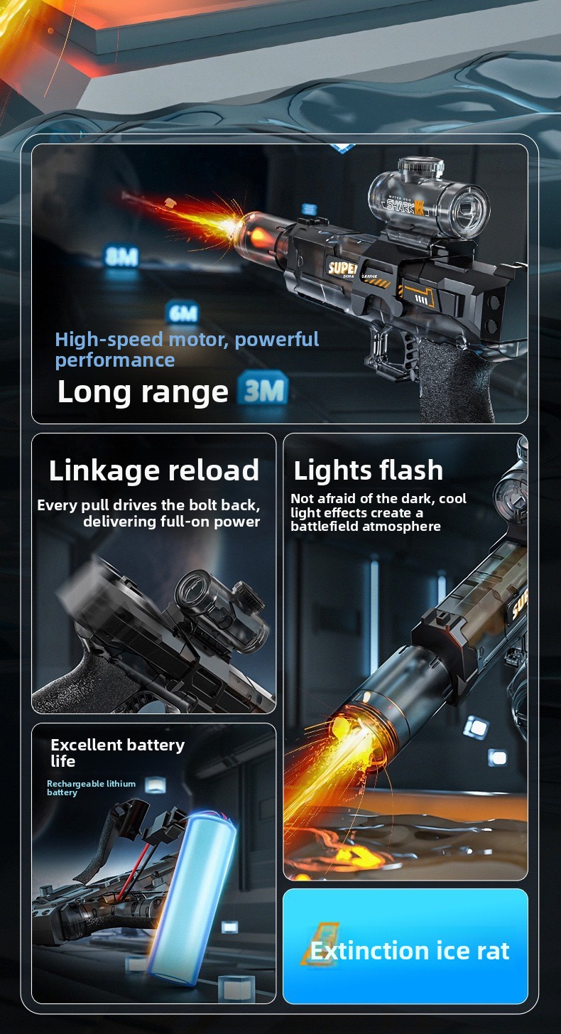 Make summer playtime unforgettable with this electric water gun for kids. Designed with automatic continuous spray, it provides rapid, uninterrupted water action for endless fun at the beach, pool, or backyard. The ergonomic grip ensures comfortable handling, while the multi-sensory design promotes hand-eye coordination, visual and auditory stimulation, and interactive learning. Perfect for children aged 4-6, this toy guarantees safe, exciting, and active outdoor entertainment.
