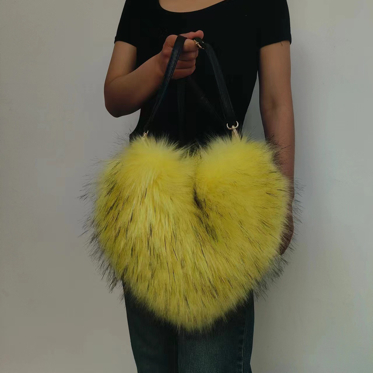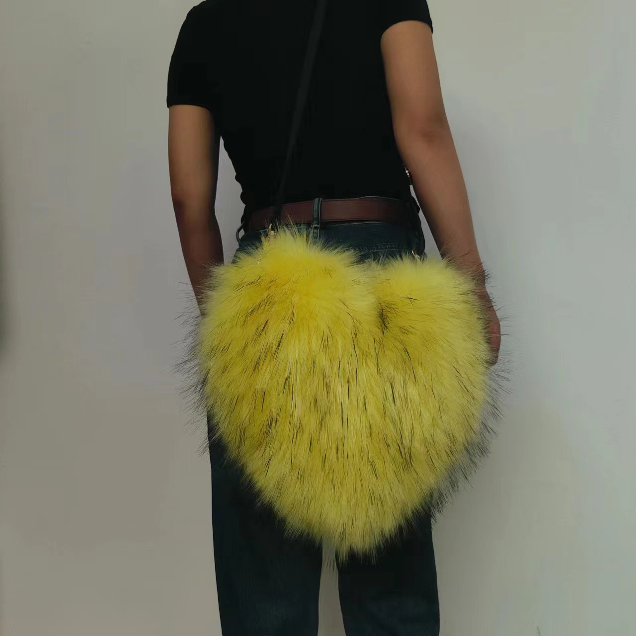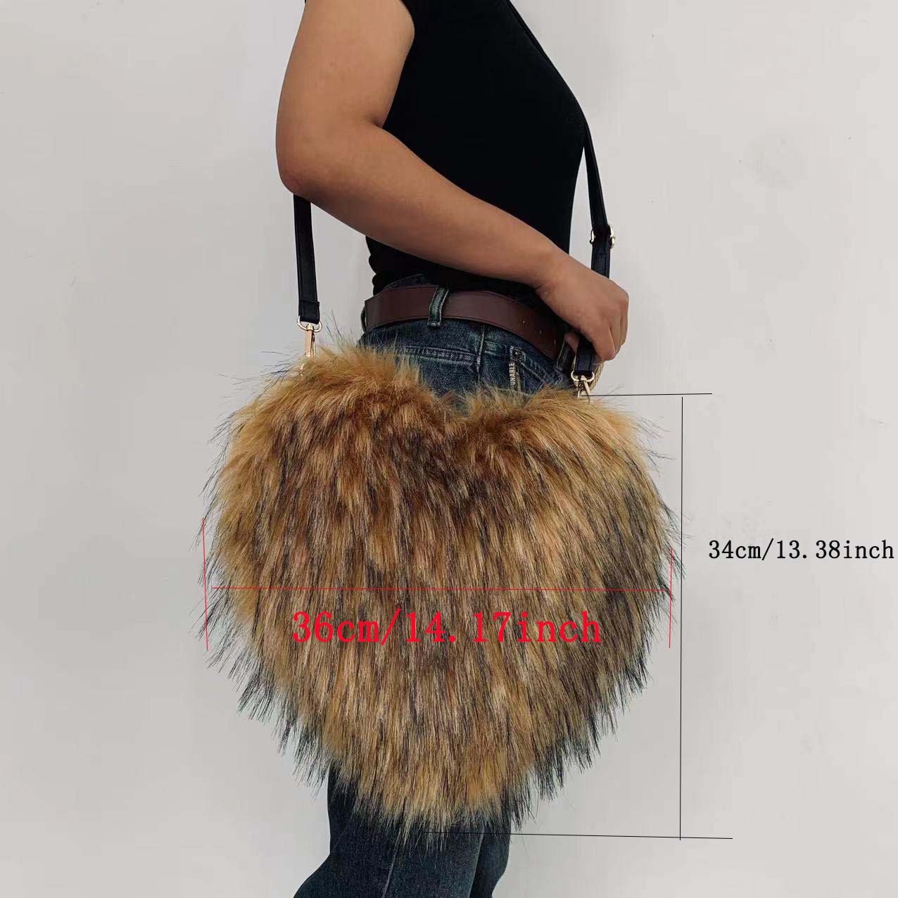 Heart-Shaped Plush Crossbody Bag Soft Raccoon Fur Shoulder Bag with Zipper Pocket, Retro Style