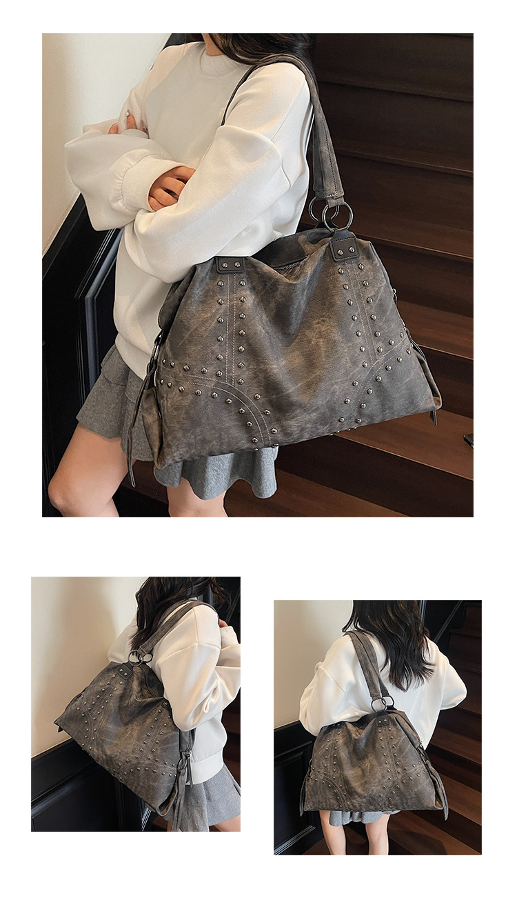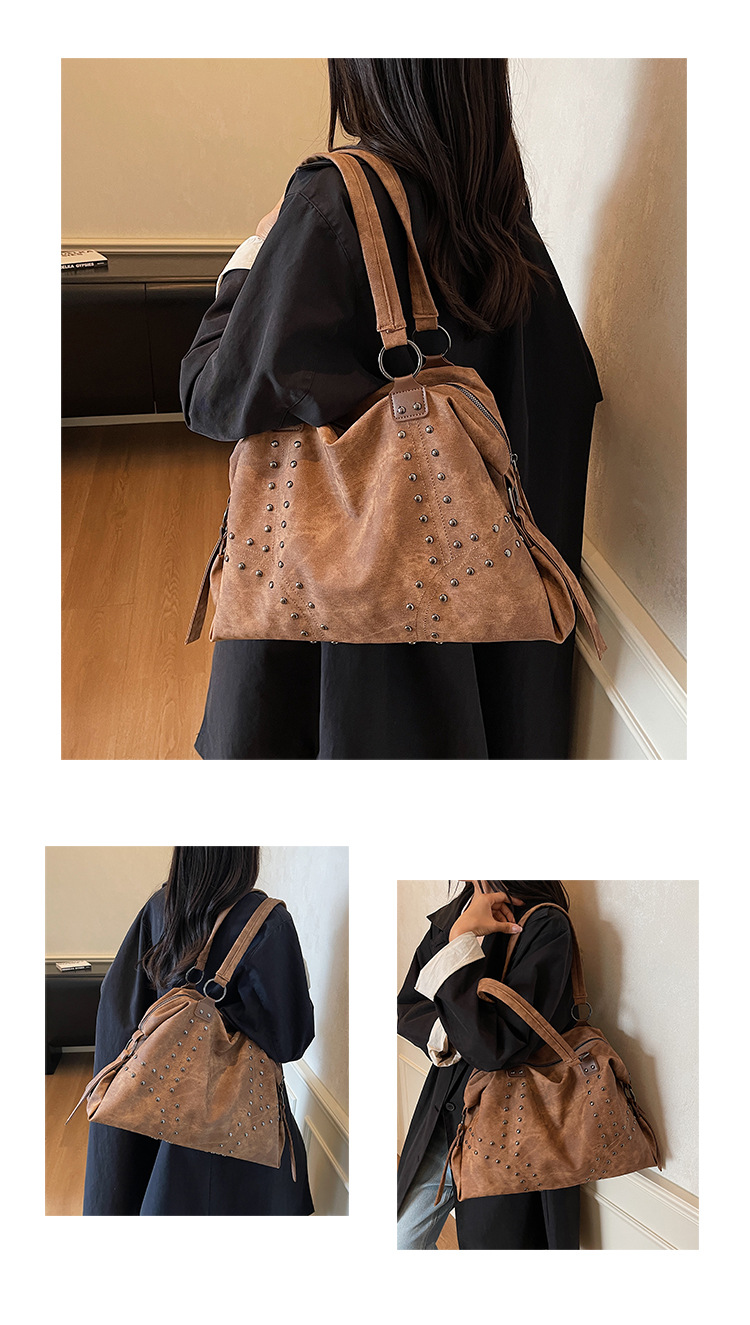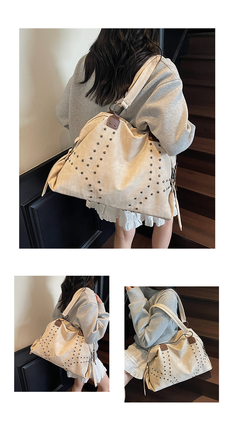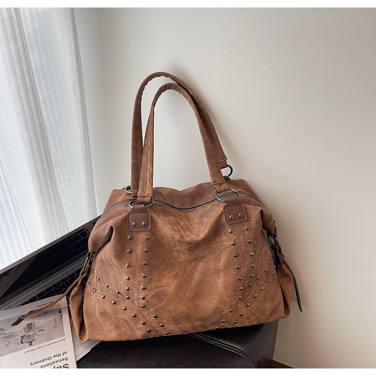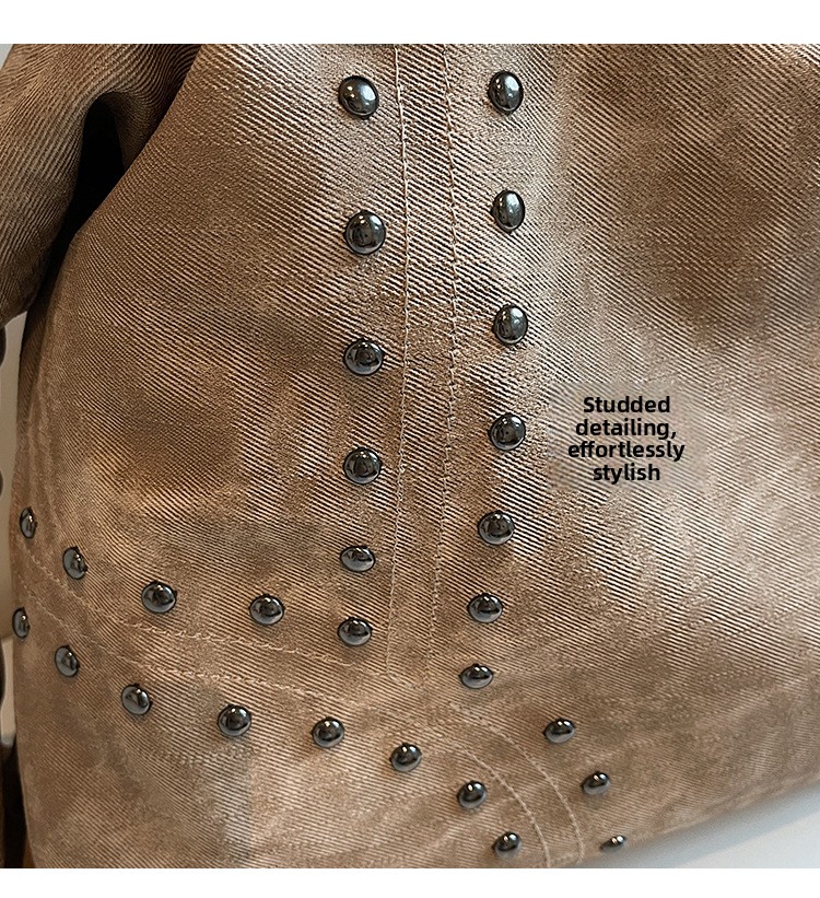 Add a bold yet refined touch to your daily wardrobe with this rivet-accented tote bag, designed for modern urban lifestyles. Featuring stylish metal rivet detailing, this bag blends edgy fashion with practical functionality. The large-capacity interior includes organized compartments to keep documents and daily essentials neatly stored, making it ideal for commuting, shopping, or casual outings. Crafted from durable PU material with a medium-soft texture, it offers comfortable carrying while maintaining structure. A secure zipper closure ensures easy access and peace of mind throughout the day.
