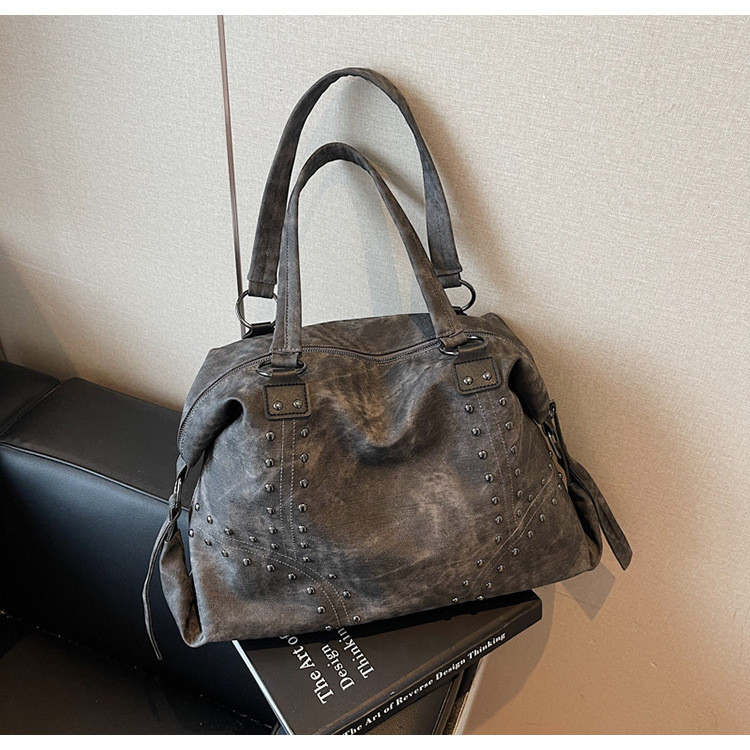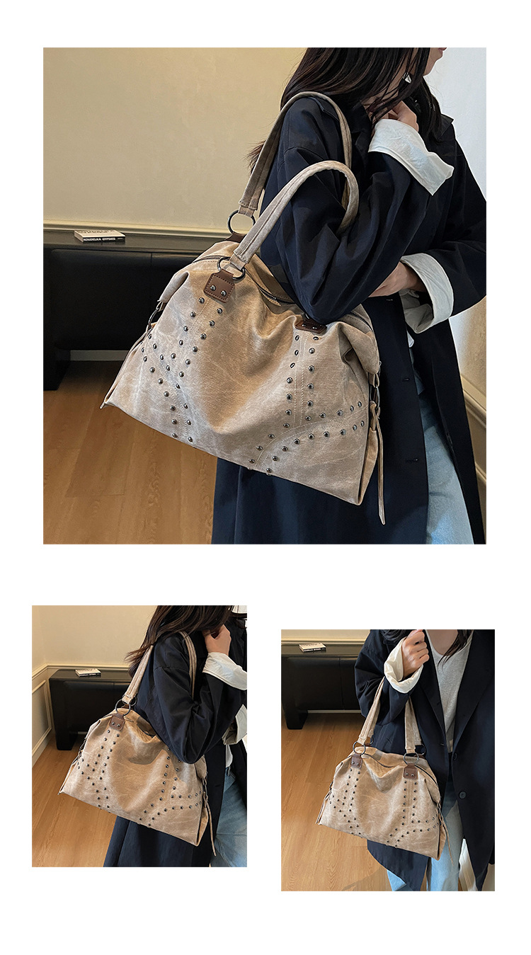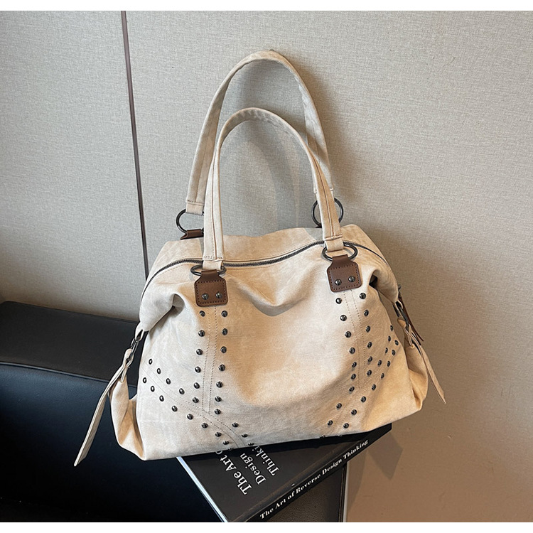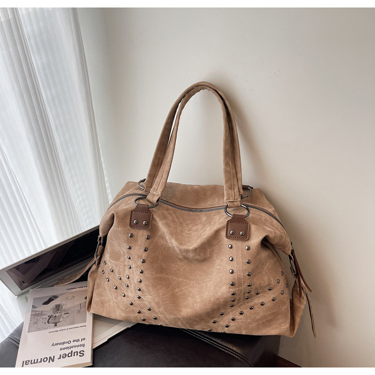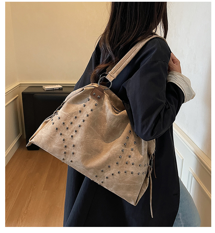 Add a bold yet refined touch to your daily wardrobe with this rivet-accented tote bag, designed for modern urban lifestyles. Featuring stylish metal rivet detailing, this bag blends edgy fashion with practical functionality. The large-capacity interior includes organized compartments to keep documents and daily essentials neatly stored, making it ideal for commuting, shopping, or casual outings. Crafted from durable PU material with a medium-soft texture, it offers comfortable carrying while maintaining structure. A secure zipper closure ensures easy access and peace of mind throughout the day.